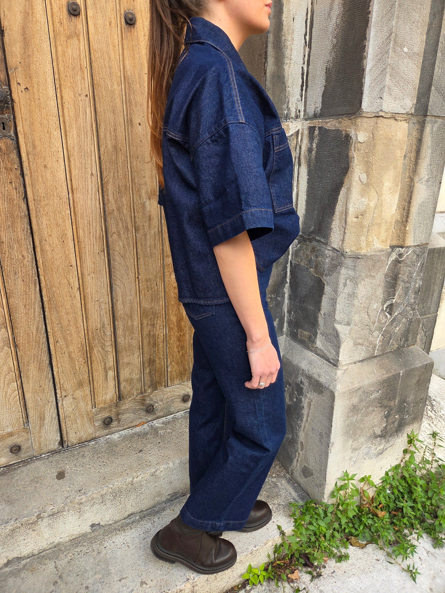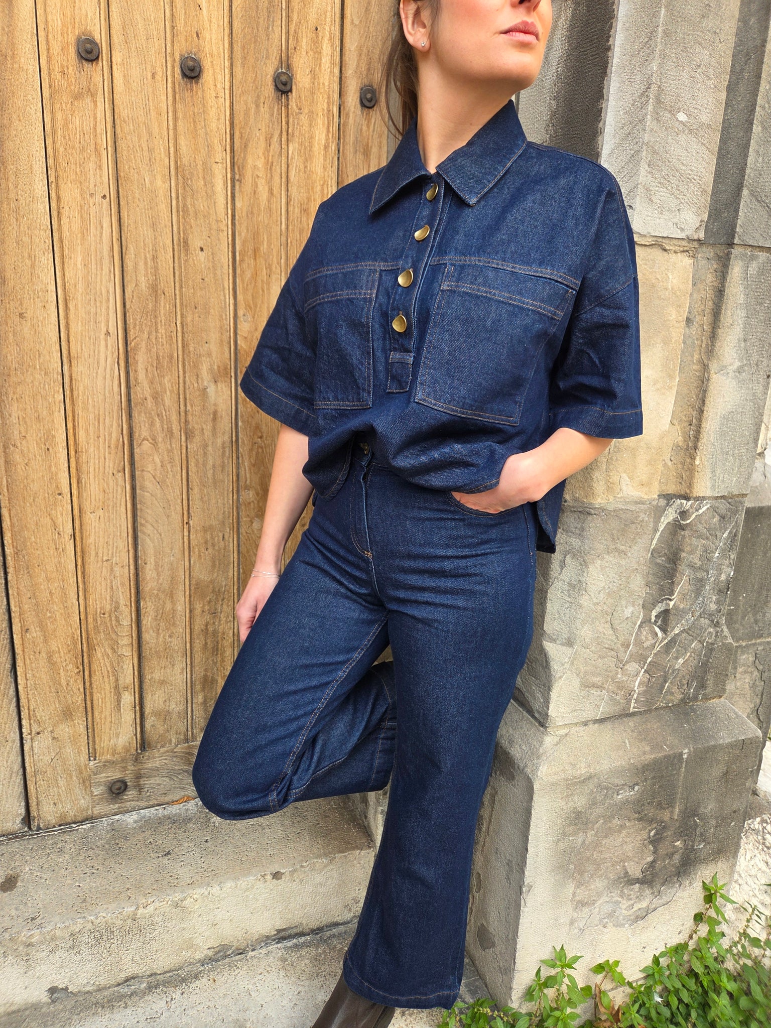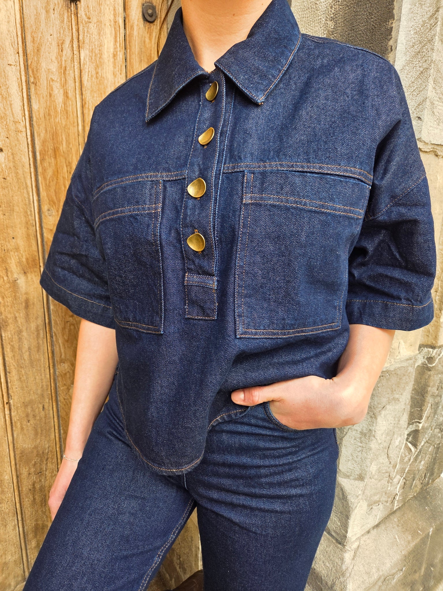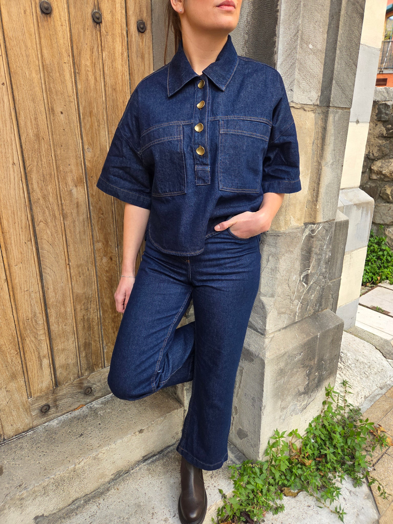 -Polo raccourci à manches courtes en sergé denim compact indigo.