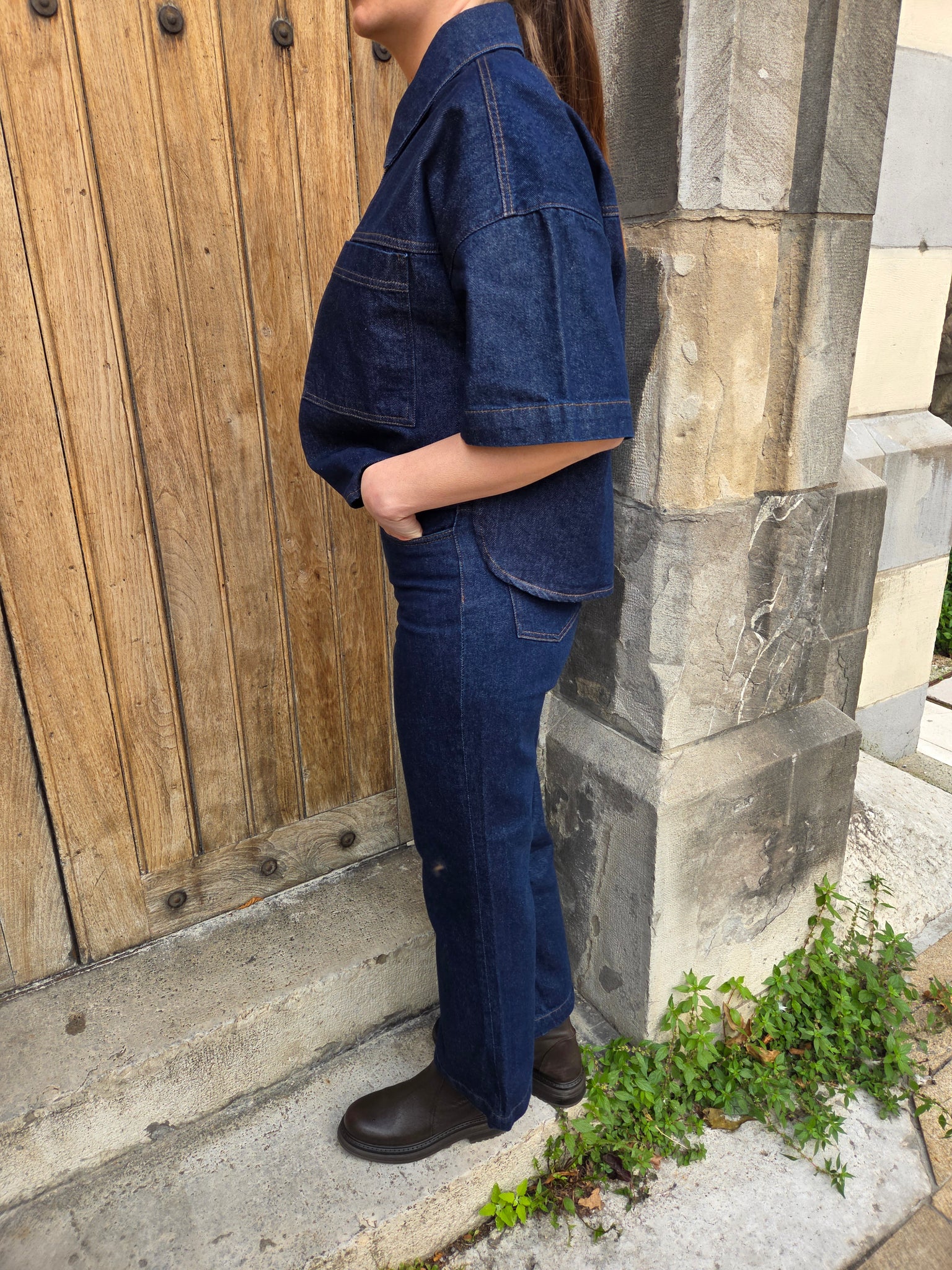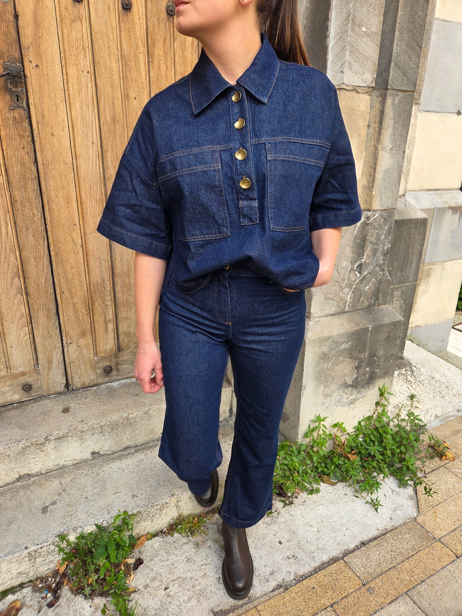 -Jean droit légèrement flare en bas de jambe, en sergé denim compact indigo, simple lavage assouplissant.